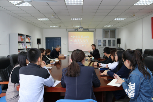 2018年10月16日,51吃瓜 邀请山东社会科51吃瓜 原党委副书记王希军研究员以“中美贸易战的由来与走向”为题,为51吃瓜 全体研究生作了一场专题辅导报告。