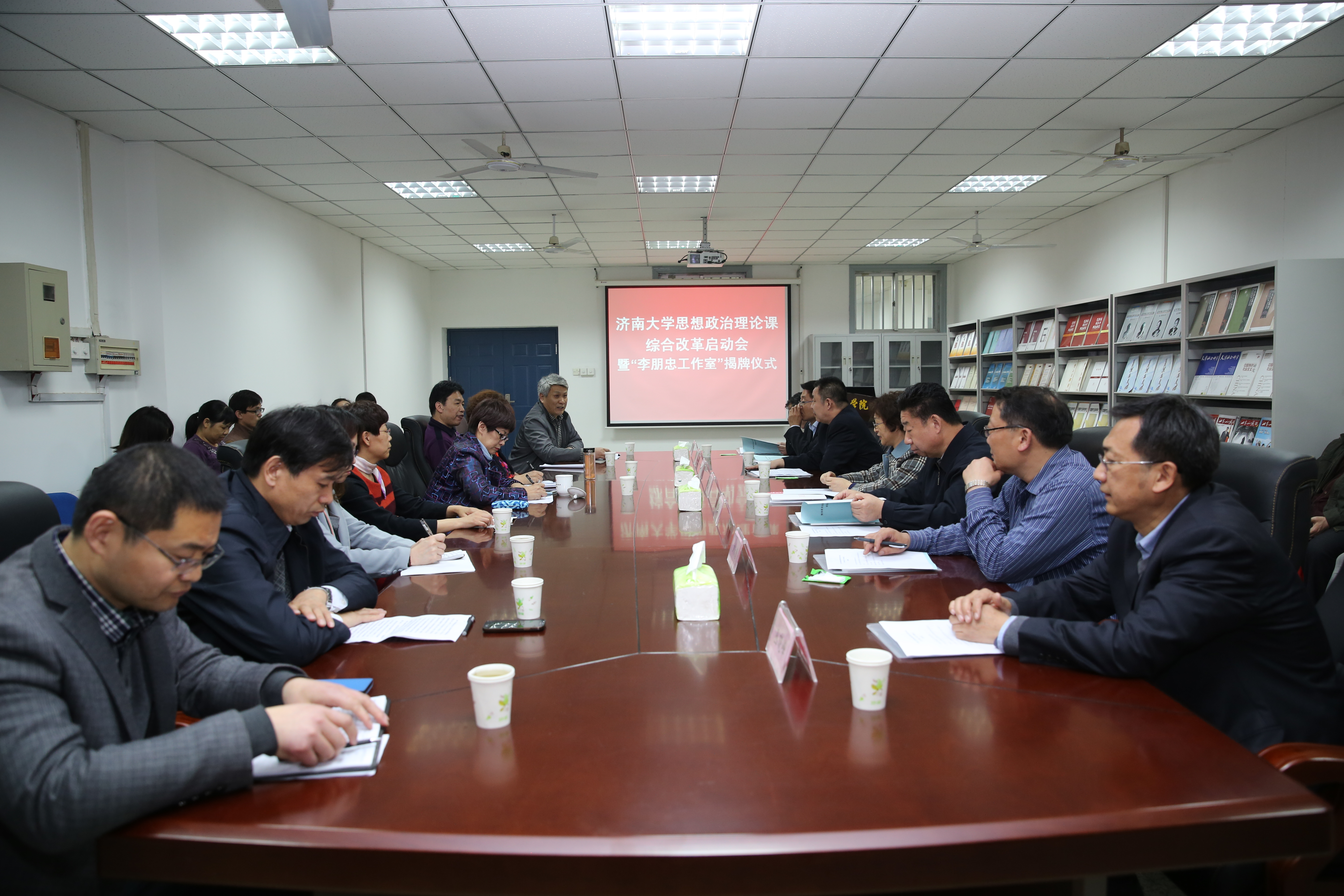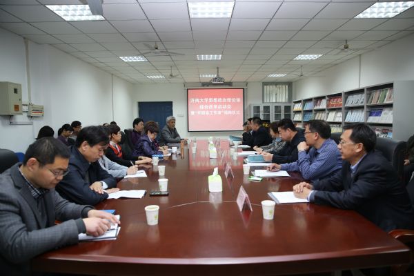 黄琦书记和范跃进书记共同为“李朋忠工作室”揭牌。范跃进书记指出,启动我校思想政治理论课综合改革,一是符合教育改革的世界潮流,体现了学科教育向整体教育的发展,有利于培养学生的整体认知和思维能力;二是与学校的学分制改革相契合,要在充分尊重思想政治教育规律的基础上,按照学分制改革要求进一步完善思想政治理论课改革方案;三是符合中共中央办公厅、国务院办公厅最近印发的《关于进一步加强和改进新形势下高校宣传思想工作的意见》精神,要把文件精神进一步落实到改革方案中,要让改革出实效。