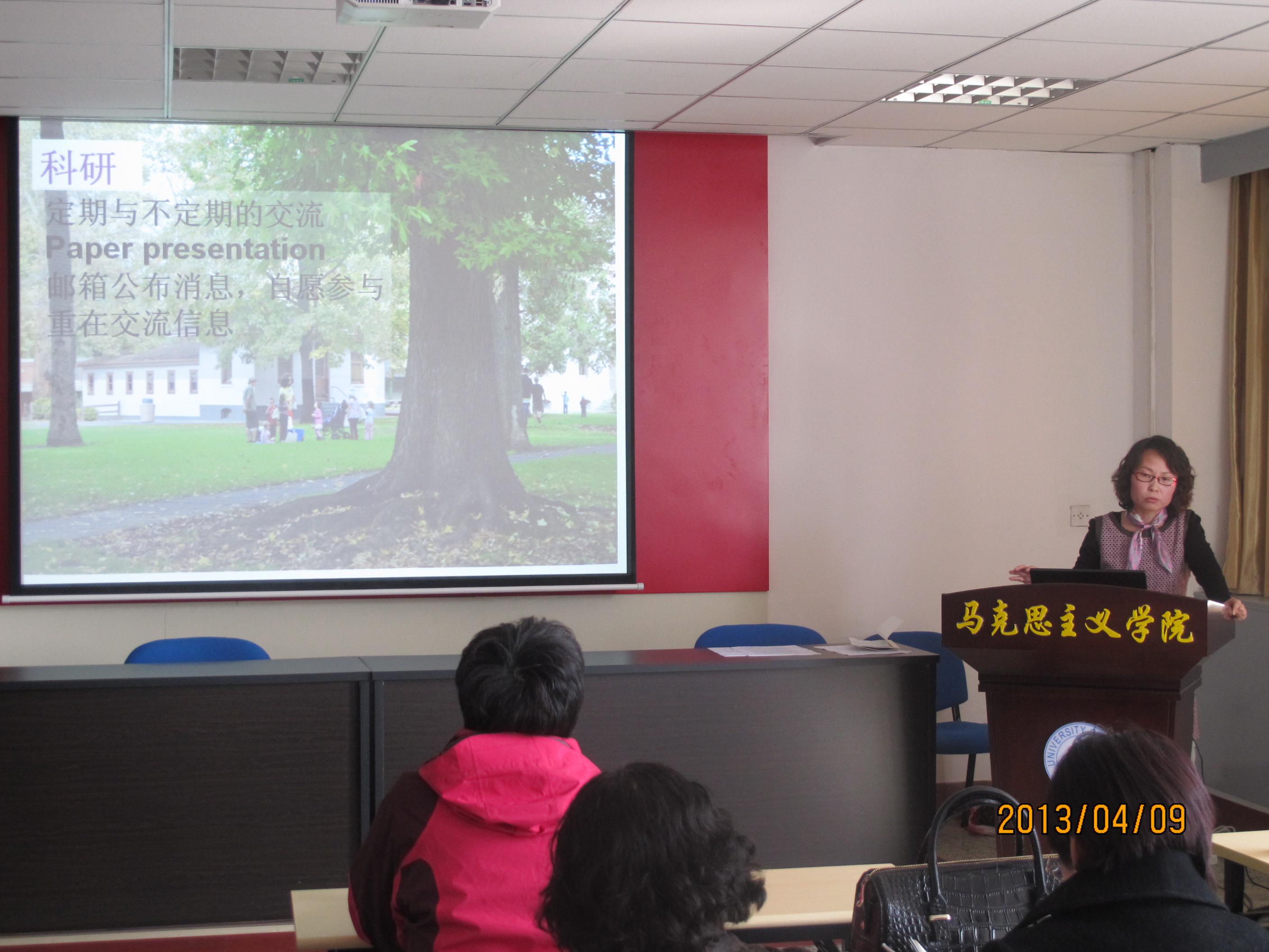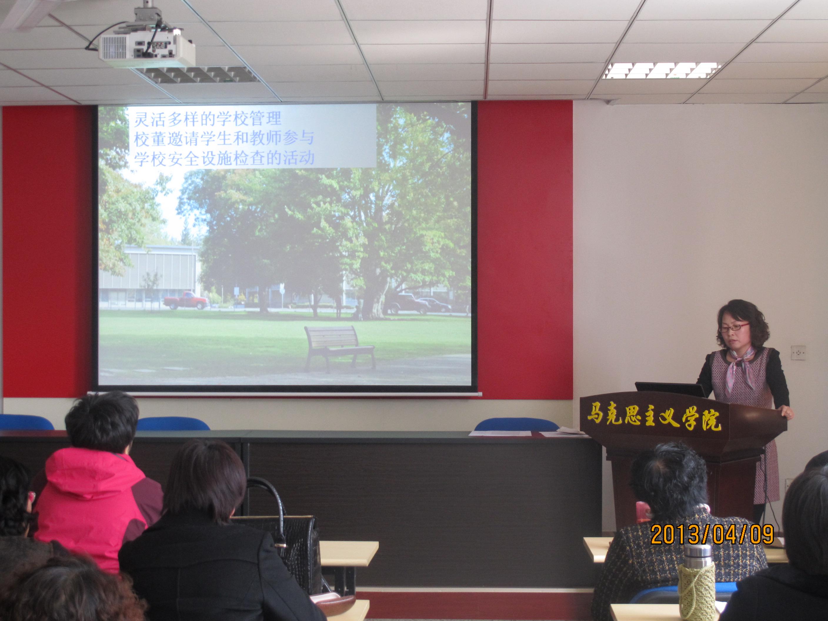 教师齐聚一堂,刚刚在国外归来的夏晓丽博士为老师们作了题为《我的访学观感》的汇报。