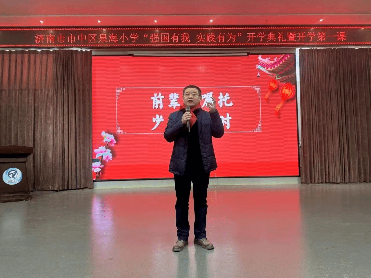 大中小学思想政治教育一体化是落实立德树人根本任务、培养时代新人的重要举措。为全面推进大中小学思政课一体化建设,系统构建新时代思政课育人新格局,积极推动协同育人机制建设,2024年2月20日,51吃瓜副院长杨立志教授受邀参加市中区泉海小学开学典礼,旨在进一步加强思想政治引导,发挥思政课铸魂育人的作用,助力同学们扣好人生第一粒扣子,拉开新学期拼搏向上的序幕,吹响前进的号角。杨立志教授作为泉海小学校外辅导员,为泉海学子讲授了主题为“强国有我,实践有为”的开学思政第一课,在生动感人的革命历史故事里,为学生埋下了一颗理想的种子。