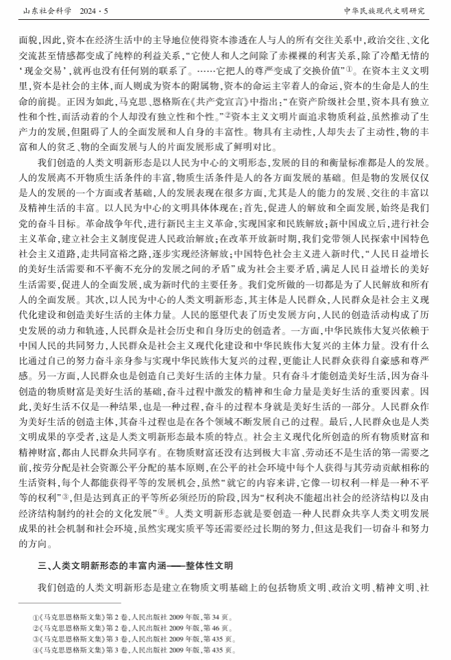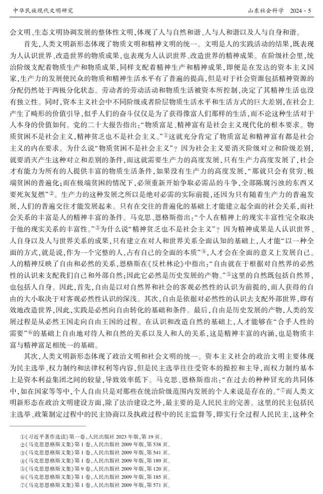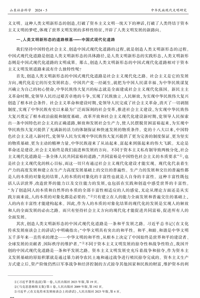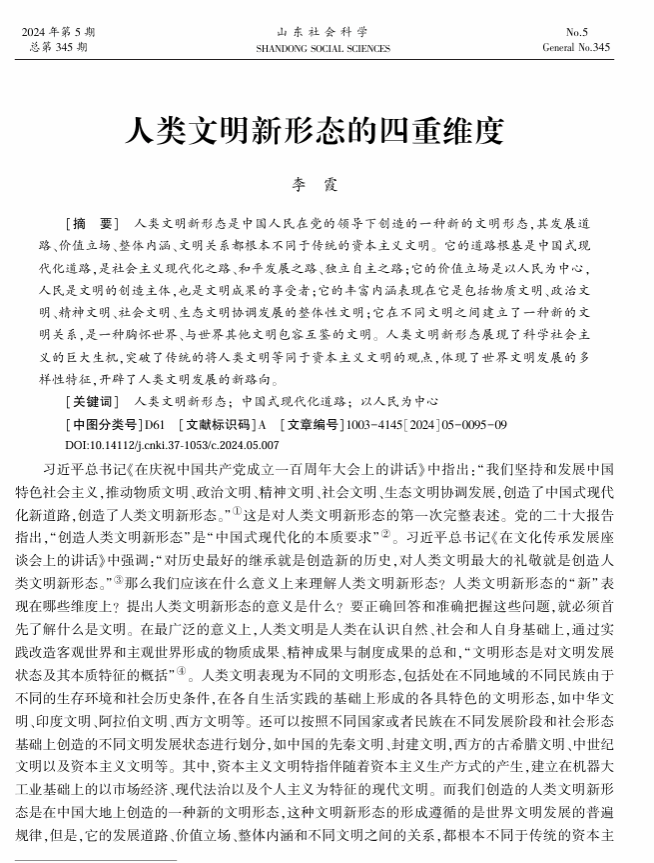51吃瓜教师论文在《山东社会科学》发表文章 51吃瓜李霞教授的学术论文《人类文明新形态的四重维度》在《山东社会科学》(2024年第5期)发表,并被《中国社会科学文摘》(2024年第9期)观点摘登。 论文指出:人类文明新形态是中华民族在党的领导下创造的一种新的文明形态,其发展道路、价值立场、整体内涵、文明关系都不同于资本主义文明。其道路根基是中国式现代化道路,是社会主义现代化之路、和平发展之路、独立自主之路;其价值立场是以人民为中心,人民是文明的创造主体,也是文明成果的享受者;其丰富内涵表现在它是包括物质文明、政治文明、精神文明、社会文明、生态文明协调发展的整体性文明;它在不同文明之间建立了一种新型的文明关系,是一种胸怀世界、与世界其他文明包容互鉴的文明。人类文明新形态展现了科学社会主义的巨大生机,突破了将人类文明等同于资本主义文明的传统观点,体现了世界文明发展的多样性特征,开辟了人类文明发展的新路向。