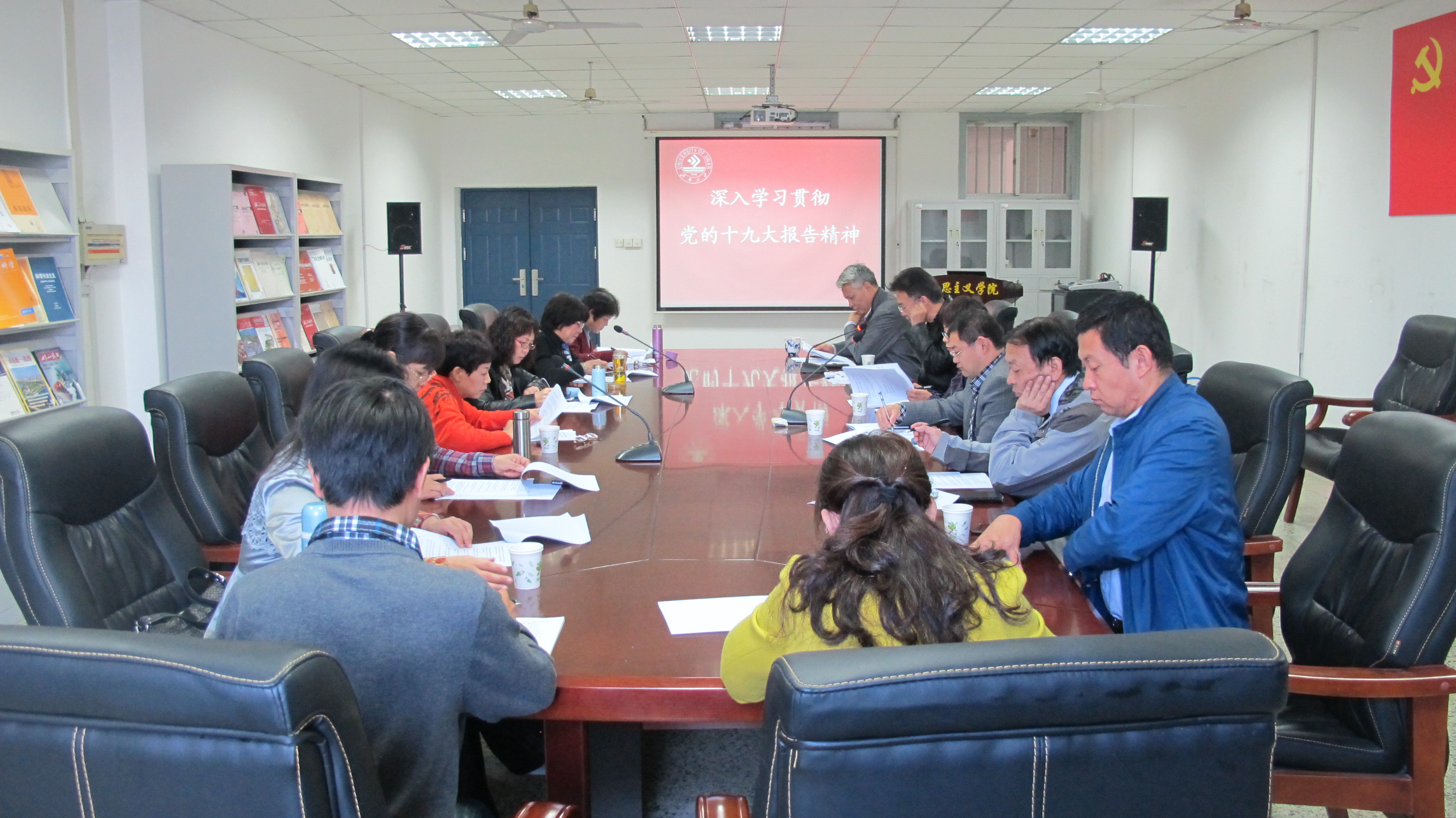 张兵亭书记要求全体教职工深入学习研究十九大报告,他指出全体思政课教师要在研究学习十九大报告的基础上,准确及时地将报告精神融入课堂教学,让广大学生及时学习理解党的十九大精神。他认为十九大报告为马克思主义理论的科研创新提供了丰富资源,要求全体教师尽快把十九大精神融入科研工作之中,并做好十九大精神的宣传工作,使之在每个师生员工中落地生根,形成生动的工作实践。
