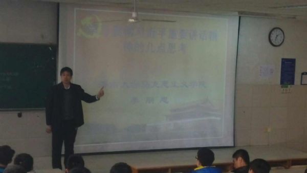 李朋忠老师首先围绕“学习贯彻习近平总书记重要讲话精神的几点思考”这一主题,从如何看待中国特色社会主义、中国经济发展及未来方向、中国的政治发展道路、建设社会主义文化强国、党的群众路线教育实践活动、如何实现中国梦、马克思主义唯物史观和辩证法等七个方面向同学们做了详细的阐述,并结合中国现有国情与历史文化背景,深入分析了习近平总书记的重要讲话精神。